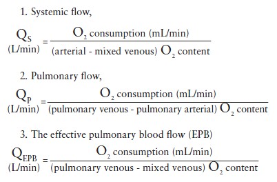 The Fick or left-sided indicator dilution methods of CO determination are employed to measure systemic flow. Using the Fick method, the following formulae apply: